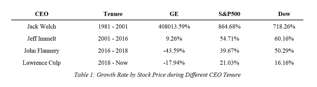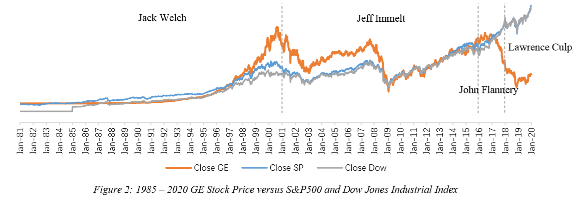 - From 2018 to present, Lawrence Culp is taking the company, leading a -17.94% change in its stock price, while S&P500 has changed 21.03% and Dow Jones Industrial has changed 16.16% (Yahoo, 2020).